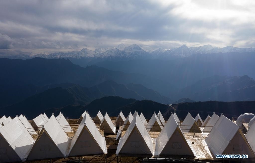 Photo taken on May 1, 2021 shows a tent hotel on the top of the Niubei Mountain in southwest China's Sichuan Province. The Niubei Mountain, with an altitude of 3,600 meters, spans from Yingjing County to Luding County in southwest China's Sichuan. There is a scenic area on its top under construction, with a sightseeing platform, a parking lot, a wooden house hotel and a tent hotel. (Xinhua/Jiang Hongjing)