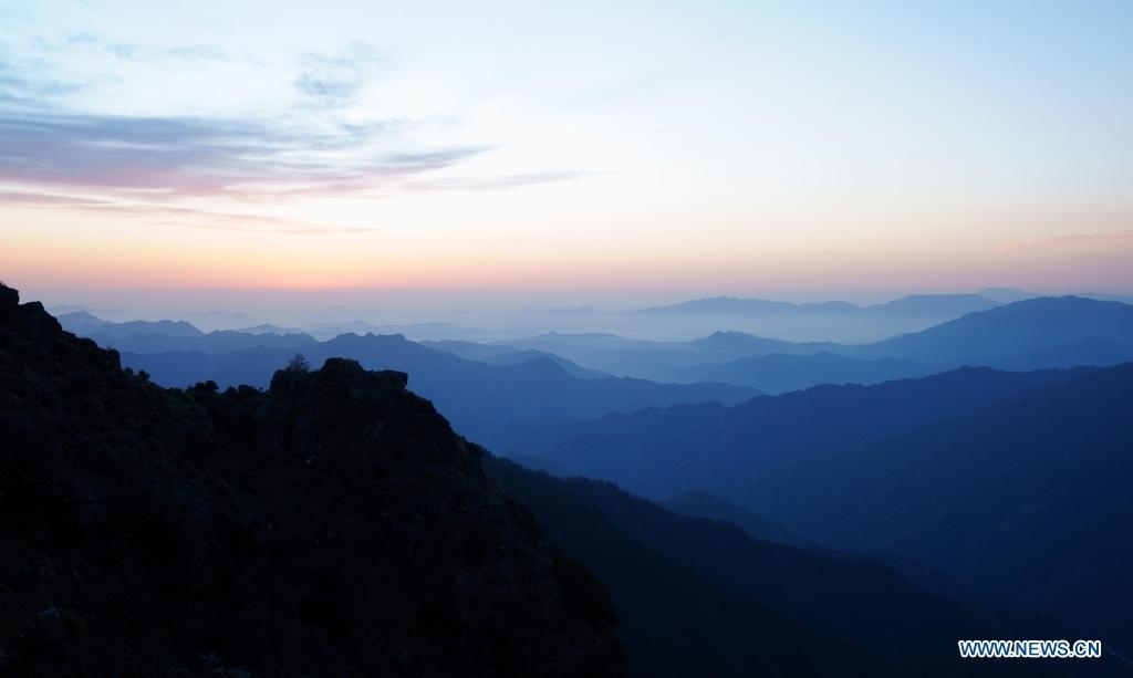 Mountains are seen from the top of the Niubei Mountain at dawn in southwest China's Sichuan Province, May 2, 2021. The Niubei Mountain, with an altitude of 3,600 meters, spans from Yingjing County to Luding County in southwest China's Sichuan. There is a scenic area on its top under construction, with a sightseeing platform, a parking lot, a wooden house hotel and a tent hotel. (Xinhua/Jiang Hongjing)
