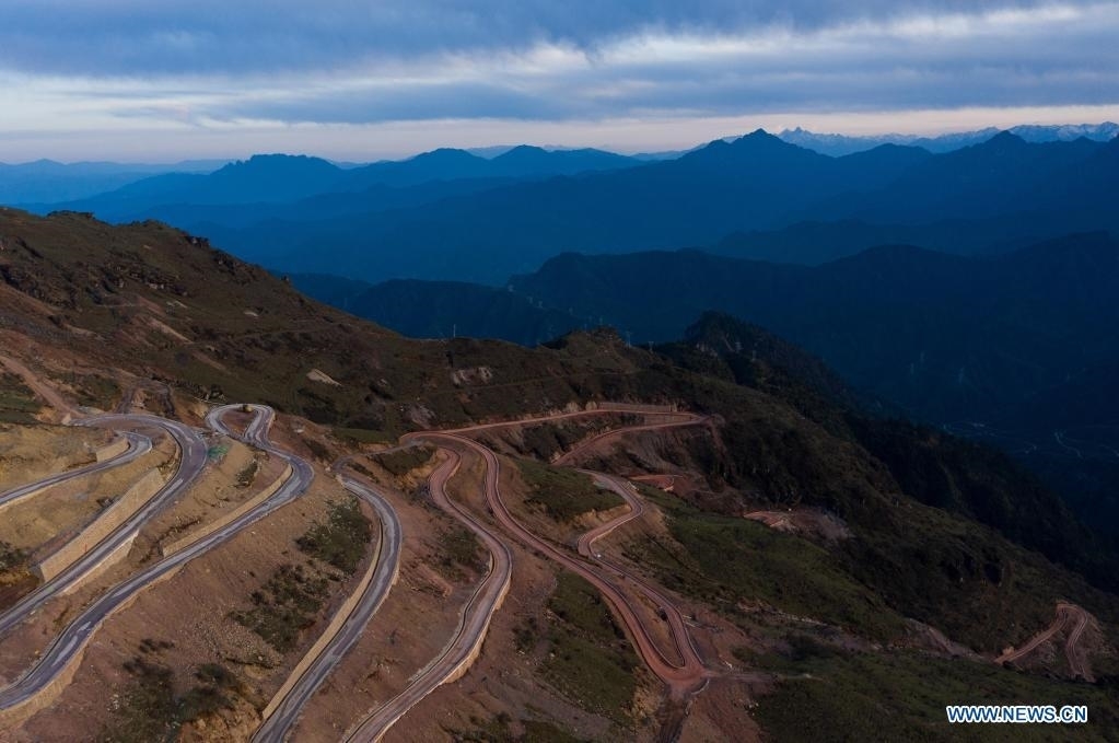 Aerial photo taken on May 1, 2021 shows a nearly complete road to the top of the Niubei Mountain in southwest China's Sichuan Province. The Niubei Mountain, with an altitude of 3,600 meters, spans from Yingjing County to Luding County in southwest China's Sichuan. There is a scenic area on its top under construction, with a sightseeing platform, a parking lot, a wooden house hotel and a tent hotel. (Xinhua/Jiang Hongjing)
