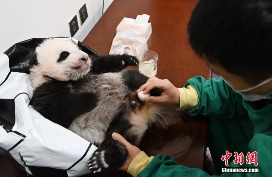 A breeder defecates a giant panda cub at Shenshuping base of China Conservation and Research Center for the Giant Panda, Wolong National Nature Reserve, Sichuan Province, Oct. 20, 2021. (Photo: China News Service/An Yuan)