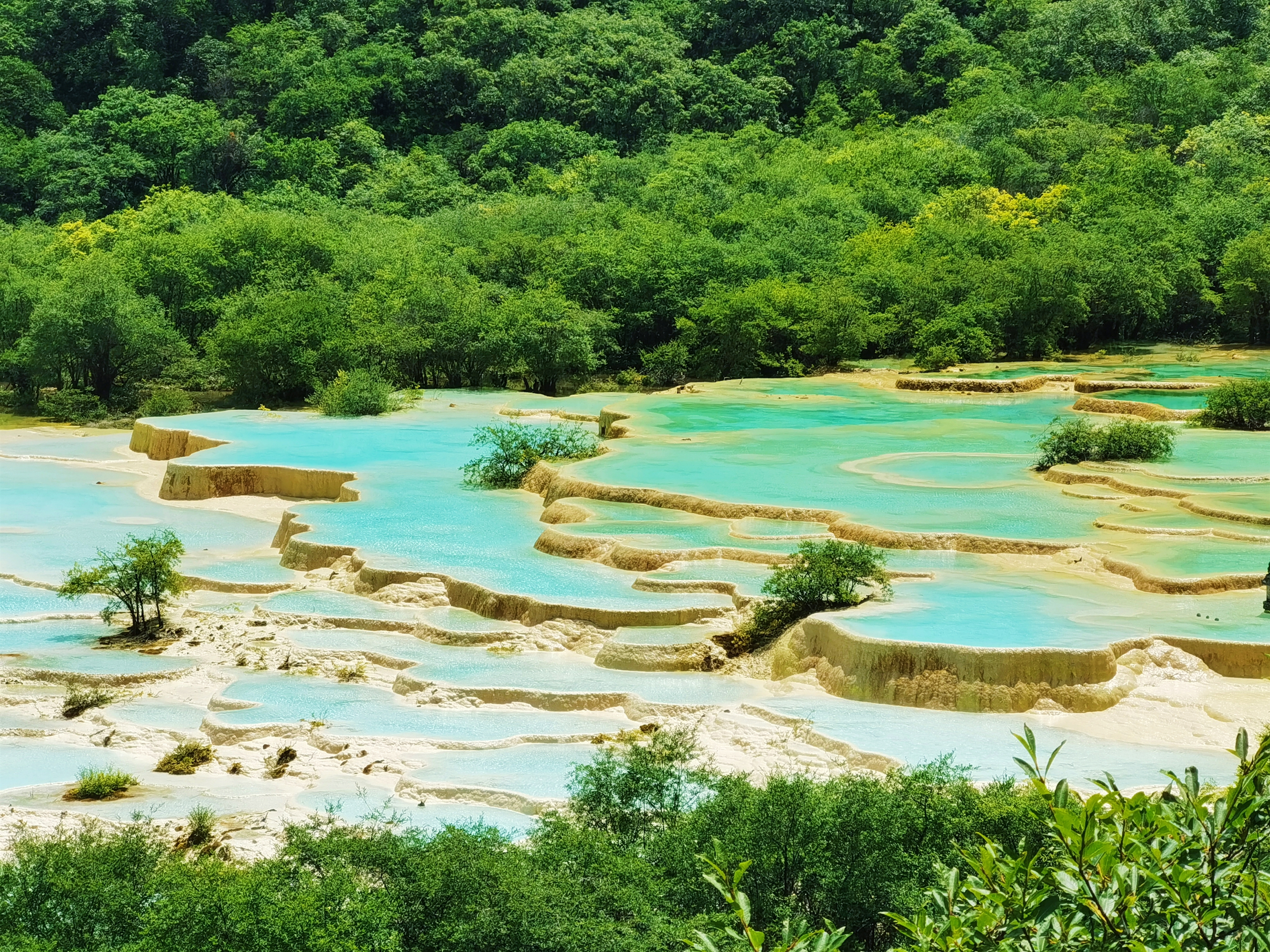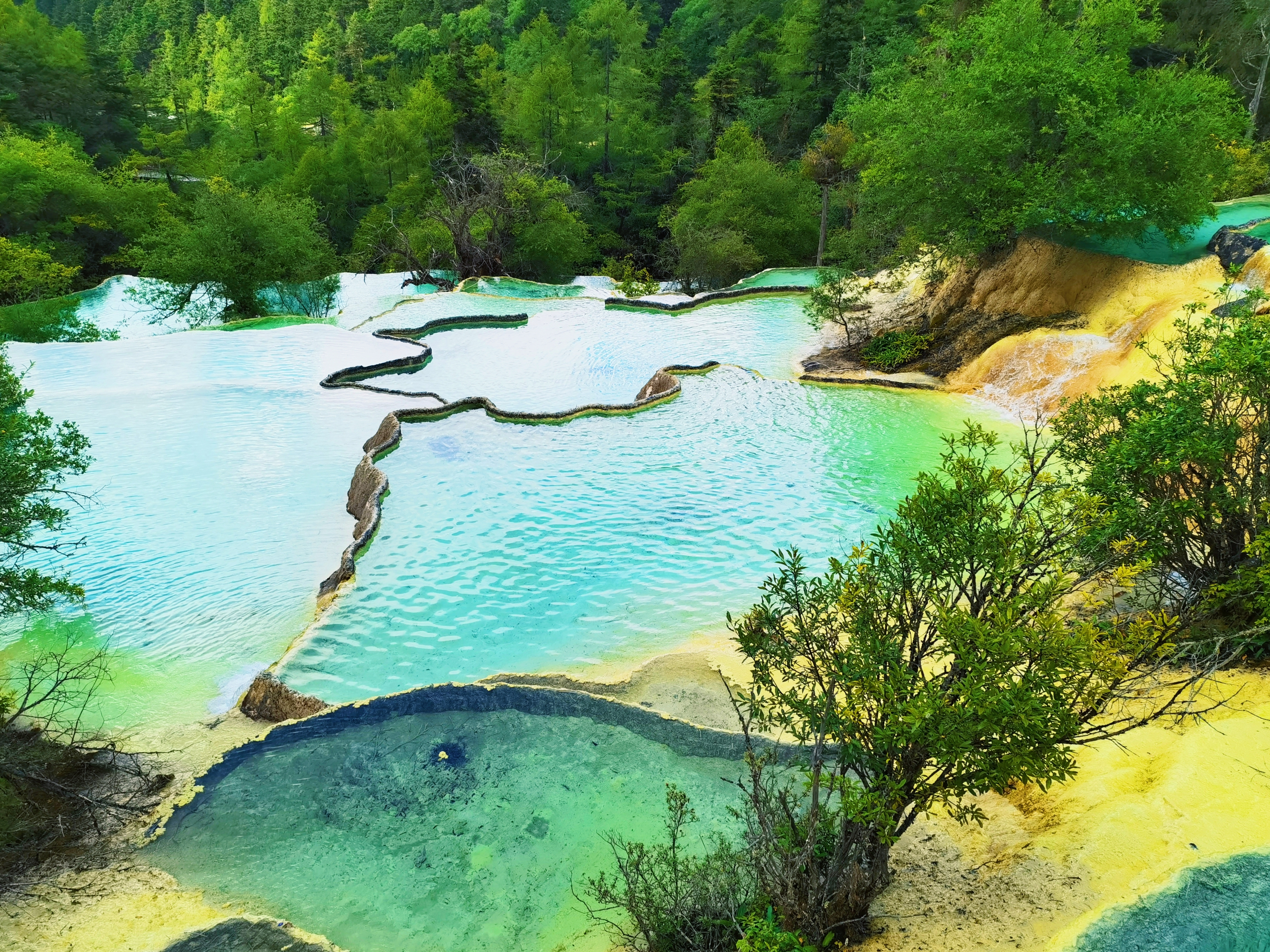 The underground water and surface water in Huanglong is rich in calcium, magnesium ion and carbon dioxide.