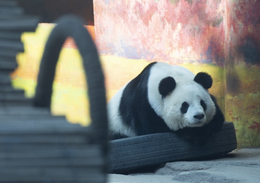 The 13-year-old male giant panda Youyou rests at Yabuli Panda House in northeast China's Heilongjiang Province, Jan. 22, 2022. (Xinhua/Xie Jianfei)
