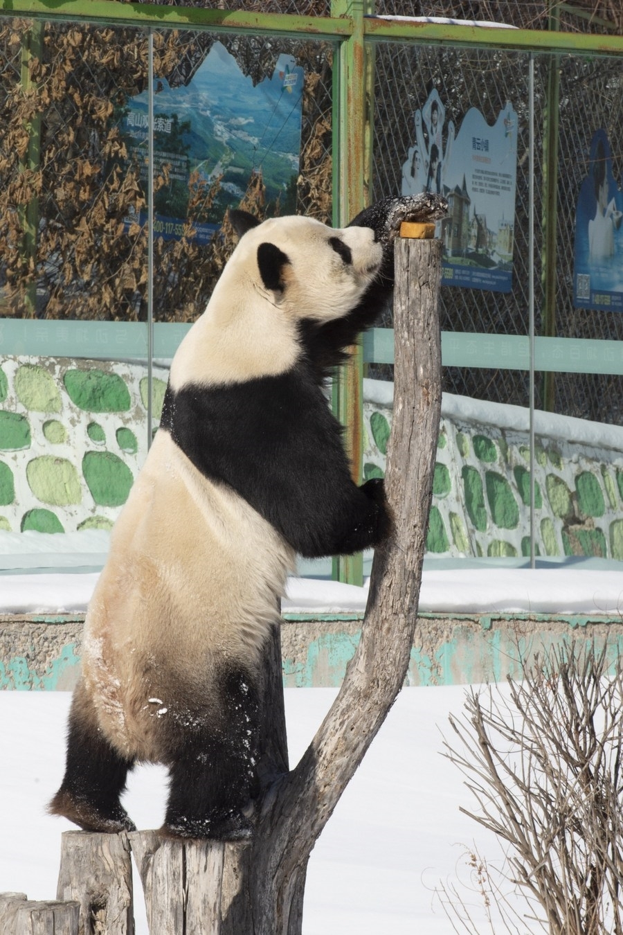The pandas at Yabuli Panda House are more active in winter than in summer and enjoy walking and playing in the snow. They spend less time outdoors when the temperature drops below minus 20 degrees Celsius, though.
