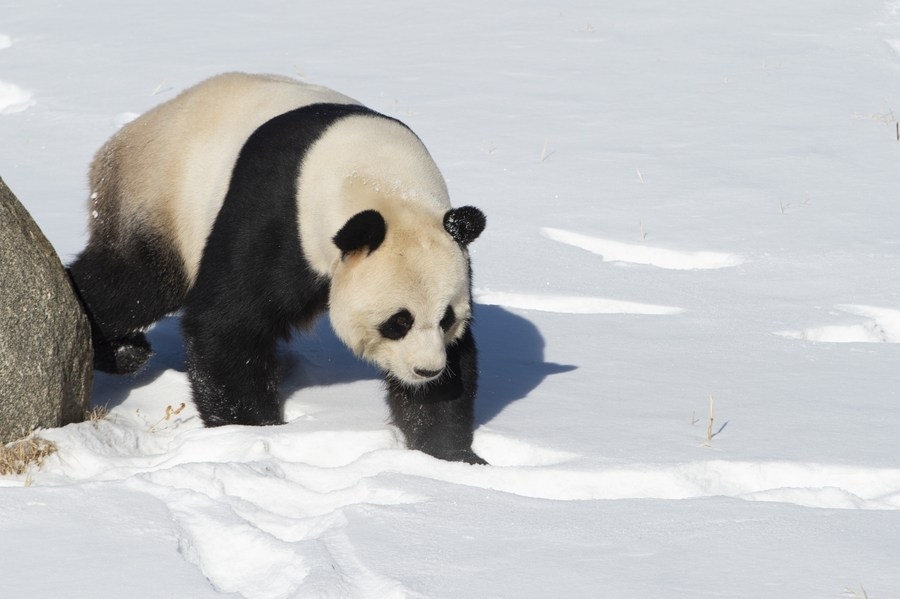 The 13-year-old male giant panda Youyou walks in the snow at Yabuli Panda House in northeast China's Heilongjiang Province, Jan. 22, 2022. (Xinhua/Xie Jianfei)