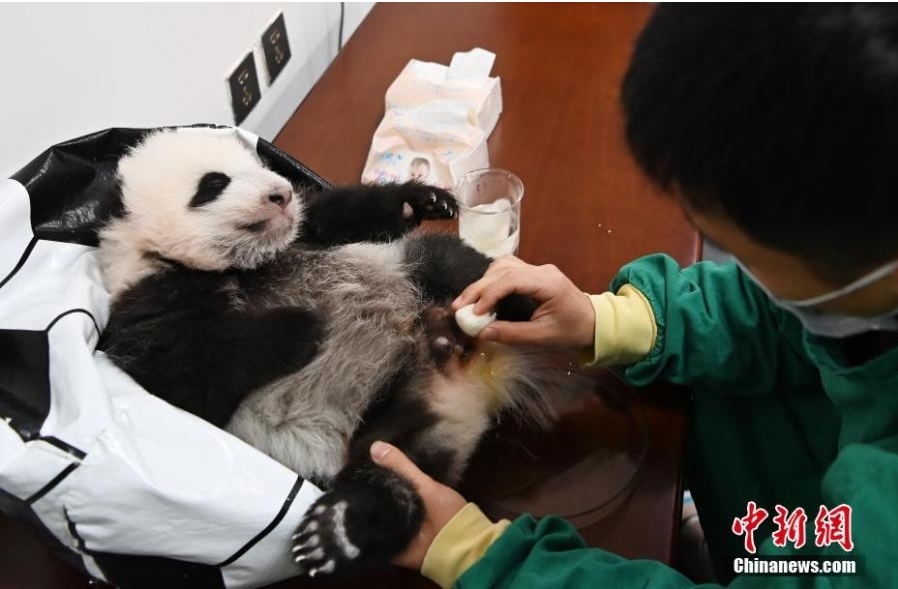 A breeder defecates a giant panda cub at Shenshuping base of China Conservation and Research Center for the Giant Panda, Wolong National Nature Reserve, Sichuan Province, Oct. 20, 2021. (Photo: China News Service/An Yuan)