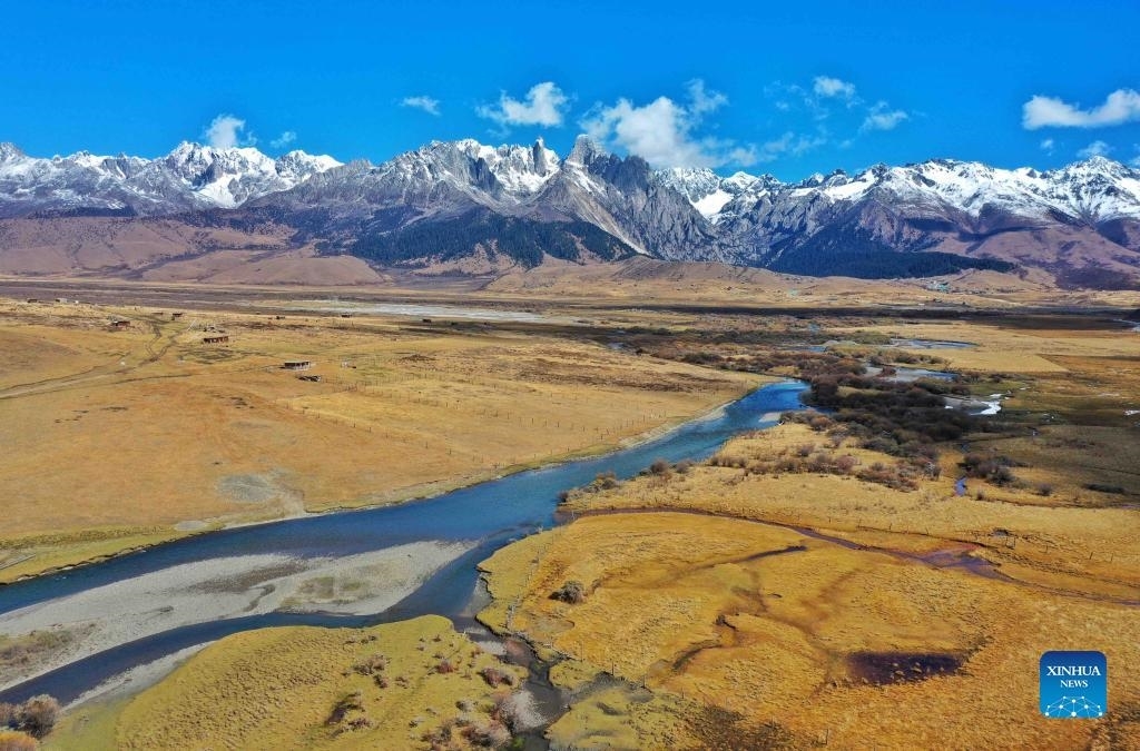 Snow mountains and grasslands are seen at the Cuopugou scenic area in Batang County, Tibetan Autonomous Prefecture of Garze, southwest China's Sichuan Province, Oct. 24, 2021. Since 2020, local government has developed the tourism resources of Cuopugou scenic area on the premise of ecological protection, which has attracted over 70,000 tourists and generated nearly ten million yuan (about 1,564,700 U.S. dollars) ticket income. (Xinhua/Liu Kun)