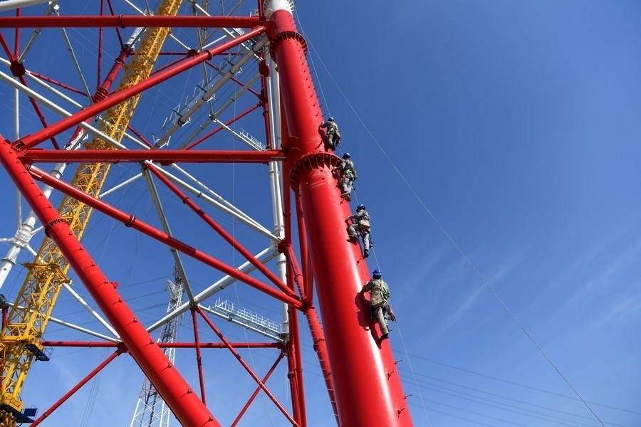 The power transmission construction workers prepare to climb up the electric tower at a construction site in Wuhu City, east China's Anhui Province, Nov. 11, 2021. (Xinhua/Du Yu)