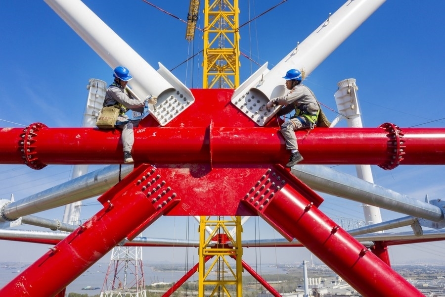 Aerial photo taken on Nov. 11, 2021 shows the power transmission construction workers work on an electric tower at a construction site in Wuhu City, east China's Anhui Province. (Xinhua/Liu Junxi)