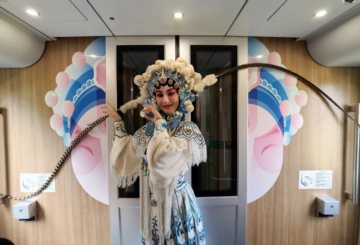 A staff member displays her Sichuan opera costume on a train painted with images of local cultural elements at Chengdu East Railway Station in the city of Chengdu, Sichuan province, on Nov 25, 2021. [Photo/China News Service]