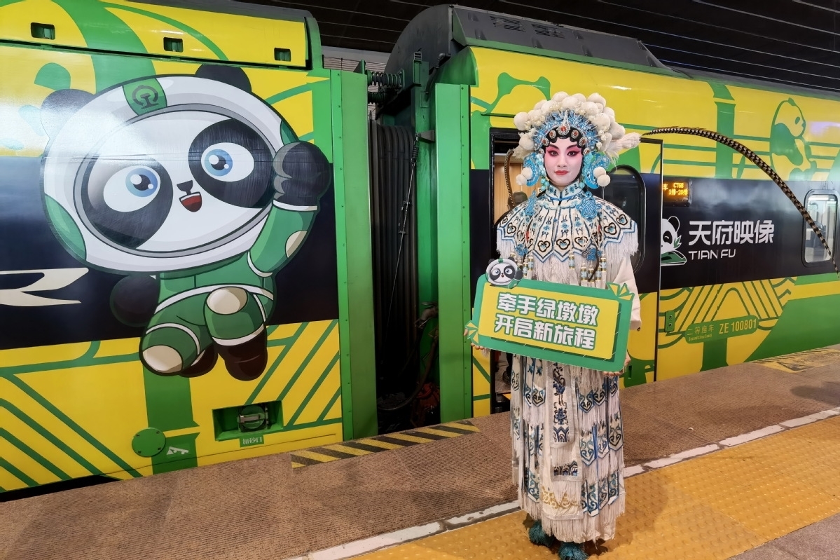 China's first Bashu culture-themed Fuxing bullet train started running on Thursday. The carriages are decorated with images representing Bashu culture, such as pandas, Sichuan opera facial masks, and Sanxingdui masks. Bashu is the ancient name for Southwest China, which includes Sichuan province and Chongqing.