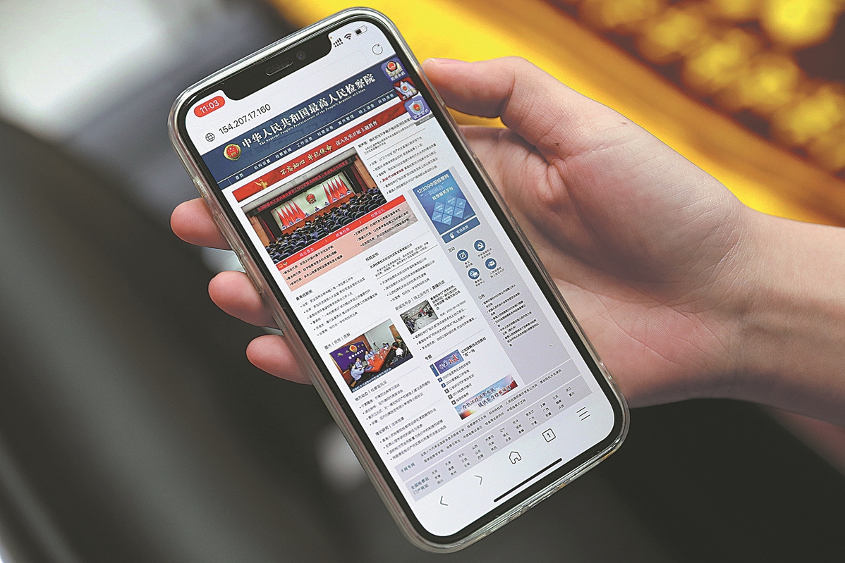 A fraudulent website mimicking that of the country's top procuratorate is displayed at an anti-fraud center in Beijing's Daxing district on April 22. [Photo by Wang Zhuangfei/China Daily]
