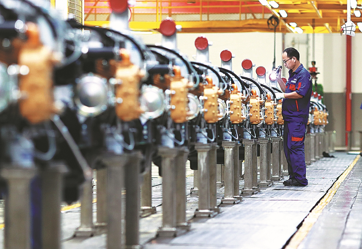 A worker checks engines at a Guangxi Yuchai Machinery Group Co Ltd facility in Yulin, Guangxi Zhuang autonomous region, in September. Yuchai has exported more than 260,000 engines to ASEAN nations by the end of 2021.[Photo provided to China Daily]