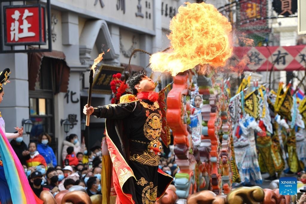 An artist performs at a movie town in Zhengzhou, central China's Henan Province, Feb. 3, 2022. People around China attended various events to celebrate Chinese Lunar New Year. (Photo by Ding Youming/Xinhua)