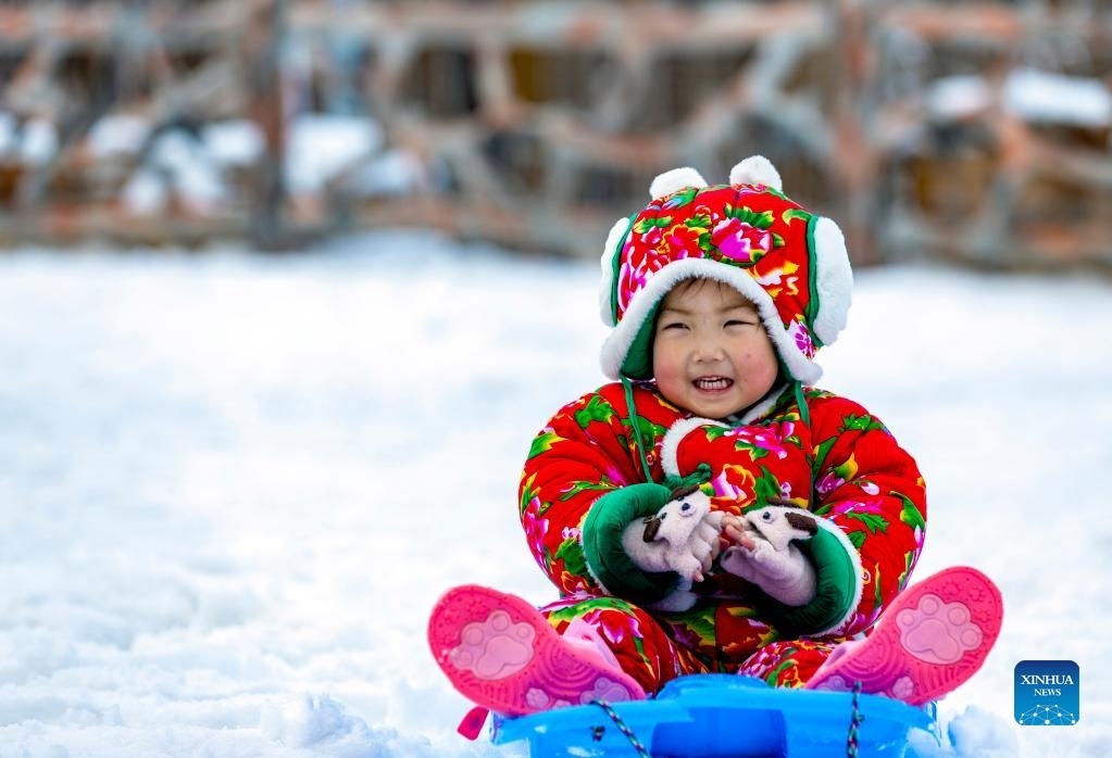 A child is seen in a scenic spot in Shaoyang City, central China's Hunan Province, Feb. 3, 2022. People around China attended various events to celebrate Chinese Lunar New Year. (Photo by Fan Hui/Xinhua)