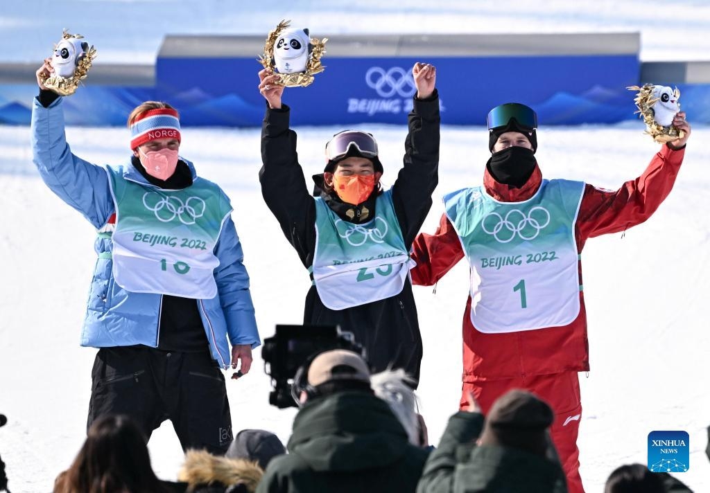 Gold medalist Su Yiming (C) of China, silver medalist Mons Roisland (L) of Norway and bronze medalist Max Parrot of Canada pose for photos after the men's snowboard big air final of Beijing 2022 Winter Olympics at Big Air Shougang in Beijing, capital of China, Feb. 15, 2022. (Xinhua/Li He)