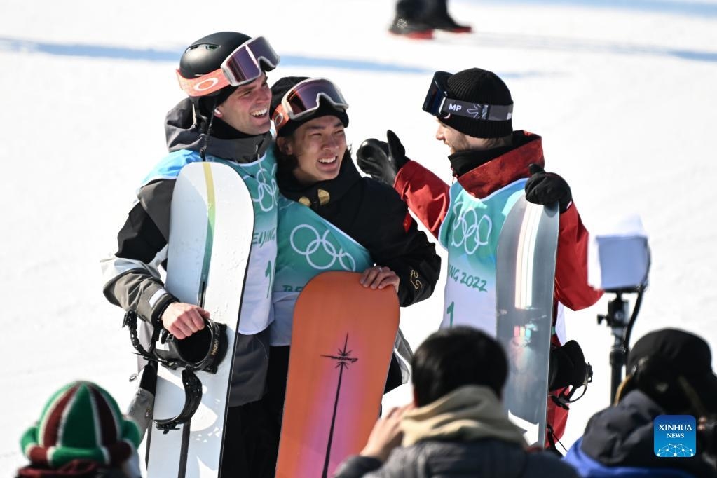 Su Yiming of China (C) celebrates with Max Parrot of Canada (R) and Mons Roisland of Norway after men's snowboard big air final of Beijing 2022 Winter Olympics at Big Air Shougang in Beijing, capital of China, Feb. 15, 2022. (Xinhua/Li He)