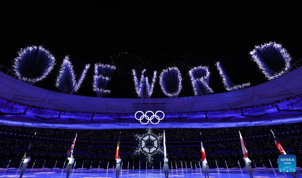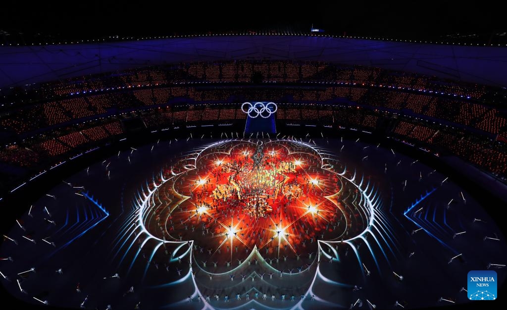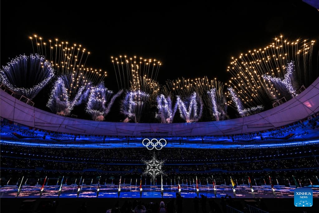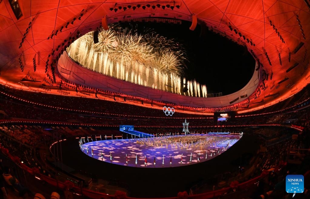 Fireworks illuminate the night sky during the closing ceremony of the Beijing 2022 Olympic Winter Games at the National Stadium in Beijing, capital of China, Feb. 20, 2022. (Xinhua/Xiong Qi)