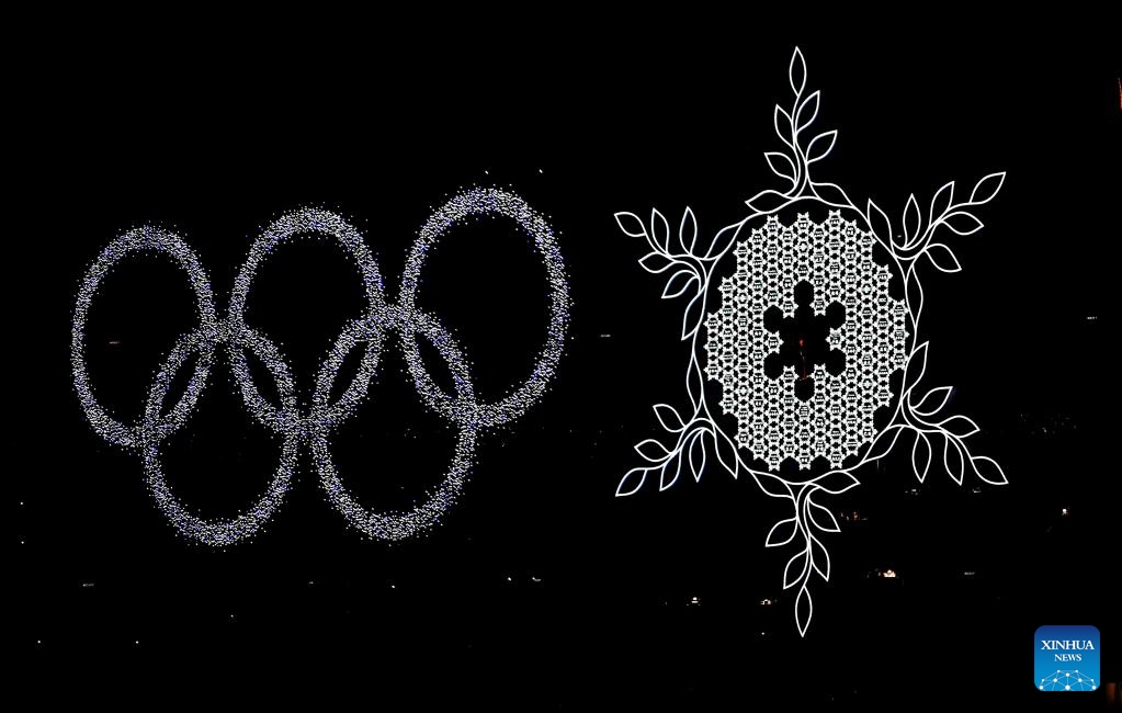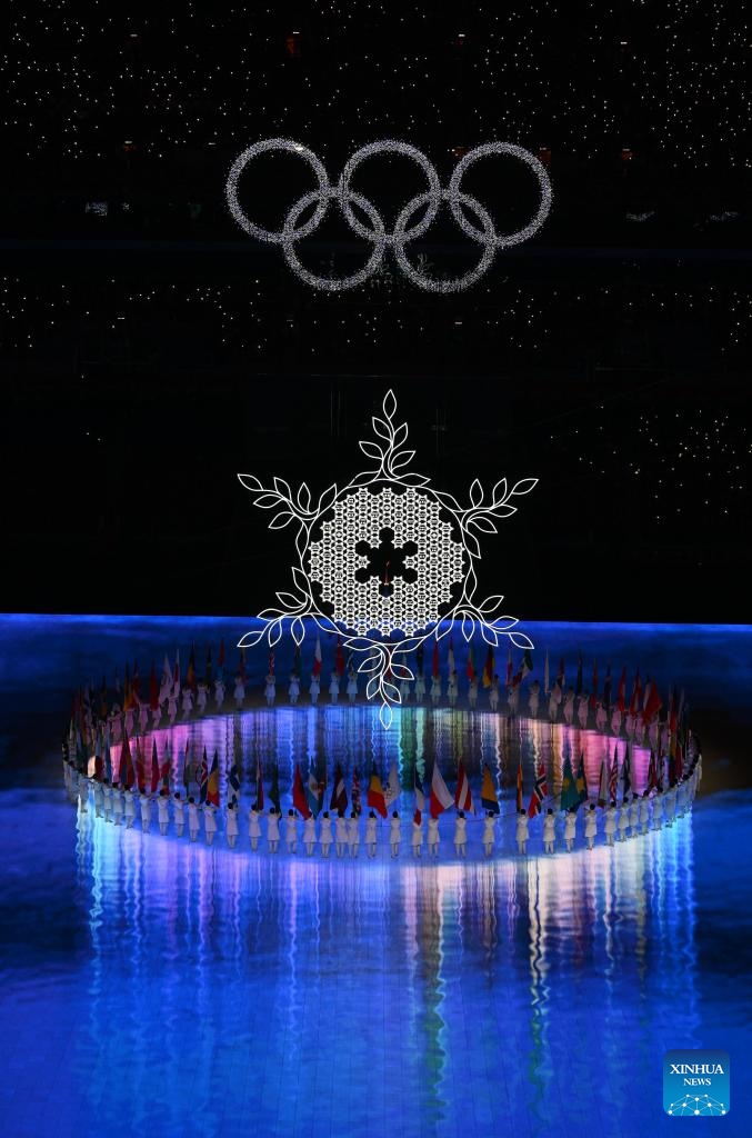The risen Olympic rings pass by the giant snowflake cauldron during the closing ceremony of the Beijing 2022 Olympic Winter Games at the National Stadium in Beijing, capital of China, Feb. 20, 2022. (Xinhua/Xue Yuge)