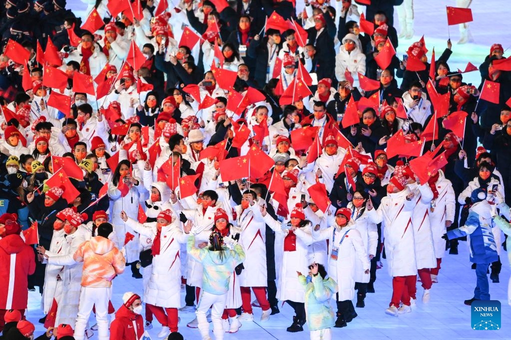 The Olympic delegation of the People's Republic of China parade during the closing ceremony of the Beijing 2022 Olympic Winter Games at the National Stadium in Beijing, capital of China, Feb. 20, 2022. (Xinhua/Huang Zongzhi)