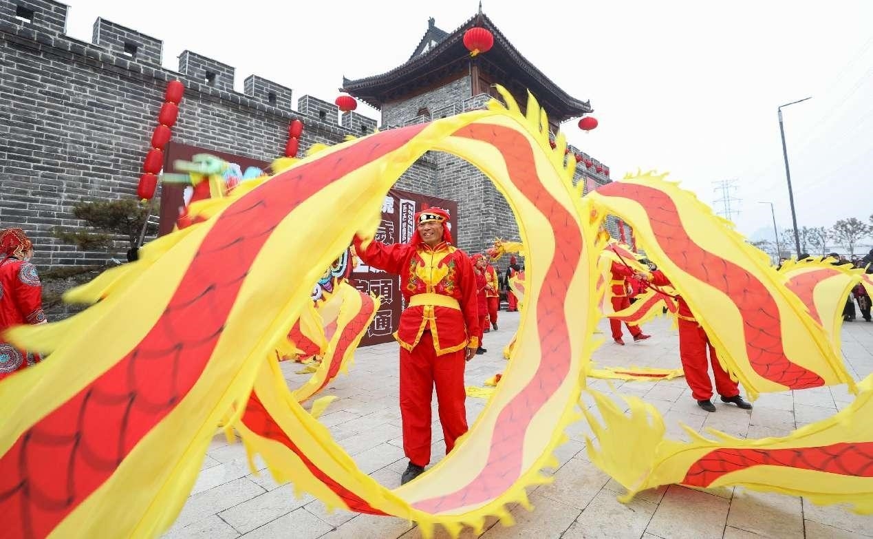 Folk art performances are staged in an ancient city in Suixi county, Huaibei, east China's Anhui province, Jan. 26, 2022. (People's Daily Online/Chen Wenxiao)