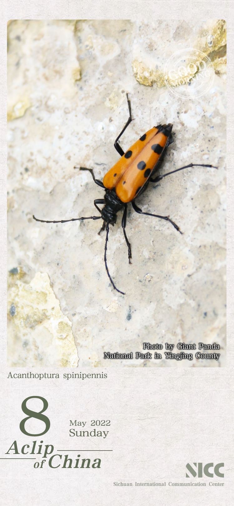 The Acanthoptura Spinipennis is a rare beetle inCerambycidae Family.Its appearancefeatures include black body, yellowish-brown sheath wings with black spots, black parts with gray fine short hairs and yellowish-brown parts with yellow fine short hairs.