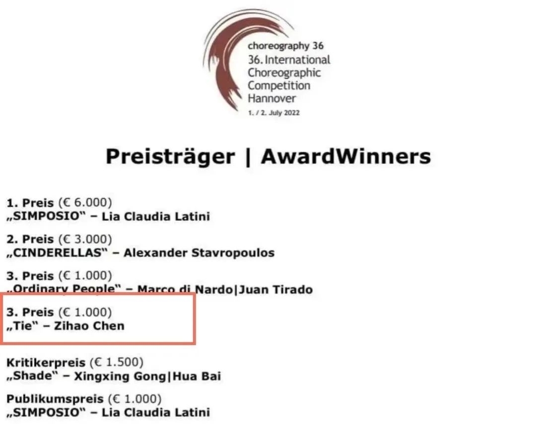 7月2日,在德国汉诺威举行的第36届国际编舞大赛上,陈梓豪凭借着参赛作品《tie》(《系》)荣获本次大赛第3名,是本届比赛中仅有的获得名次的中国选手。