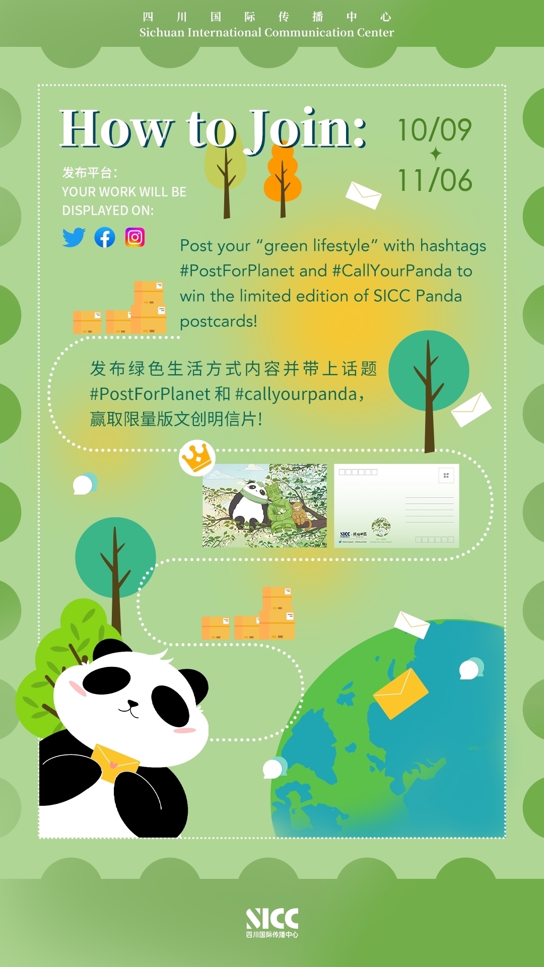10月6日至11月6日期间,全球网友在Facebook、Twitter、Instagram等海外社交平台参与 #PostForPlanet 和 #callyourpanda话题,发布绿色生活方式内容,即有机会获得“CallYourPanda”原创手绘明信片。