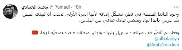 “这体现了两国之间友好的文化交流,卡塔尔招待得很好,为苏海尔(京京)和索拉雅(四海)提供了健康专业的环境!”
