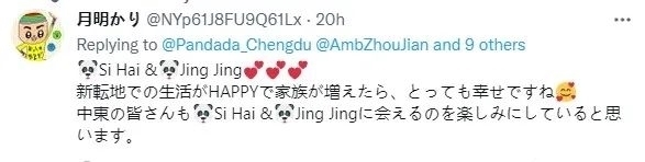 “希望两只熊猫可以在新的地方生活得很开心!之后要是能有个宝宝就更幸福了,当地人应该也很想见到它们吧!”