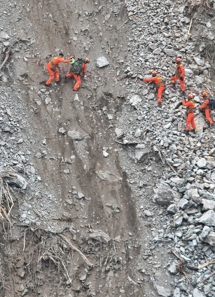 2022年9月6日,四川甘孜州泸定县发生地震后,四川省消防救援纵队成都支队和四川省森林消防总队在垂直的百米悬崖上,用绳索和身躯“搭”起救援通道。
