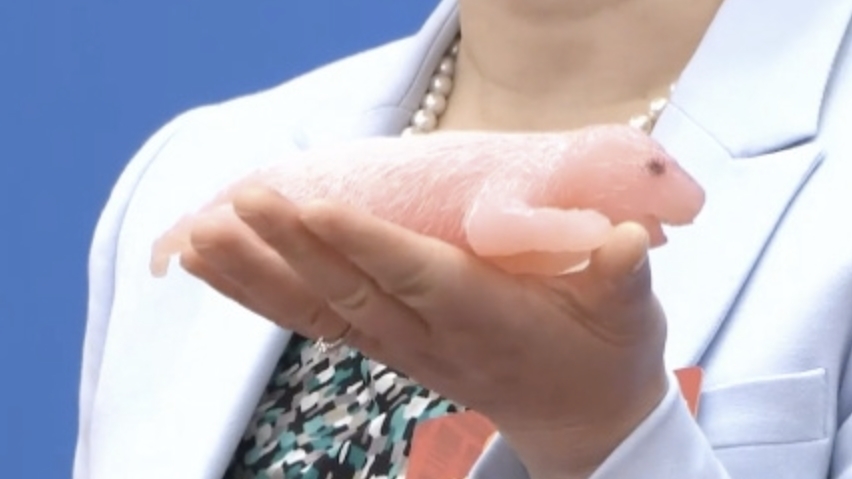 On March 5th, Hou Rong, an NPC deputy and the vice director of the Chengdu Research Base of Giant Panda Breeding, attended the deputies' passage of two sessions with a newborn panda simulation model.