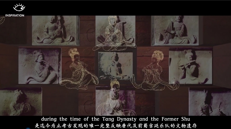As the only unearthed relic to show us a complete royal band during the time of the Tang Dynasty and the Former Shu (907-925), the ‘twenty-four carved figures of female musicians and dancers’passed the years,thus, frozen in place and in time, until 2019 whentheir musical accompaniment that had been lost for a thousand years was brought back to life.The twenty-four female musicians and dancers were ‘resurrected’in the form of dramas, showcasing the bright and magnificent music of the Tang Dynasty to the world.At the same time, a Chinese female orchestra, namely an excavation of the so-called‘twenty-four carved figures of female musicians and dancers’was created, making the historical relic buried underground for a thousand years ‘rebirth’—a blending of ancient music and modern technology.