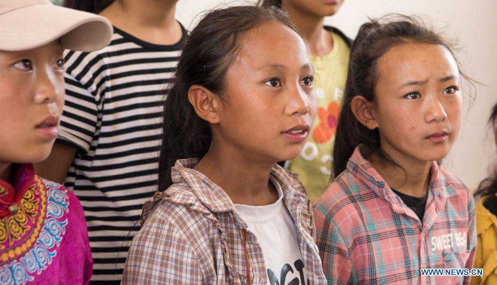 Girls sing at Dacao central primary school in Puge County, Liangshan Yi Autonomous Prefecture, southwest China's Sichuan Province, Aug. 6, 2021. The all-girls choir at Dacao central primary school in Puge County gained wide attention after the videos of their performances are shared on short video platforms. The choir was invited to attend a music festival in Beijing, capital of China this summer. (Xinhua/Tang Wenhao)
