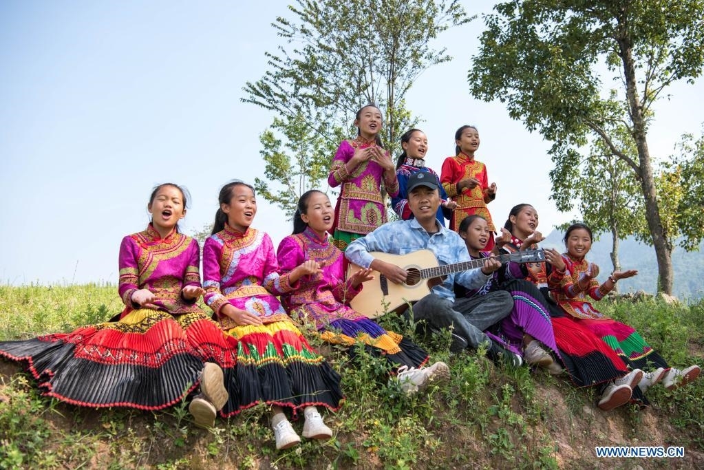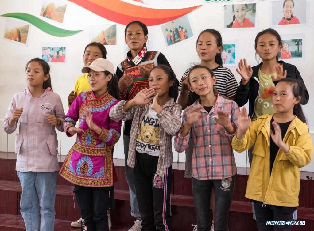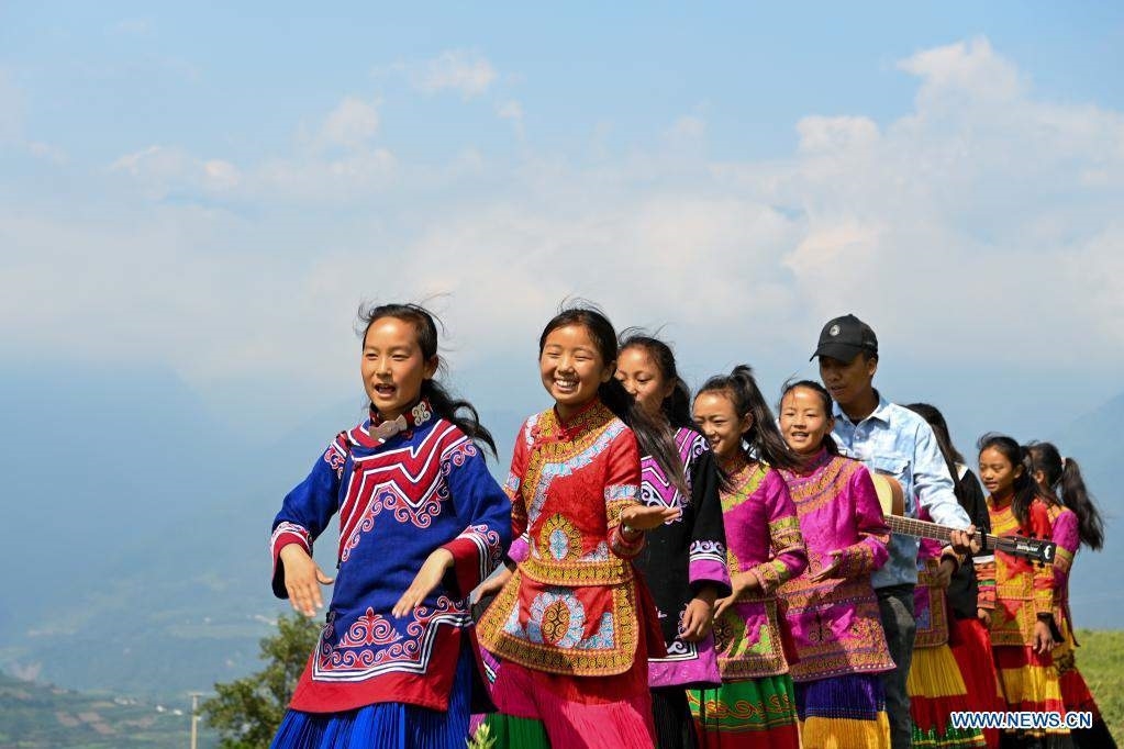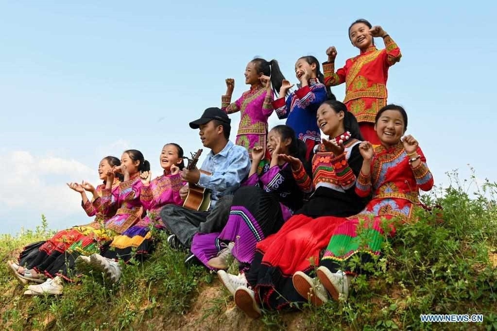 Girls and their teacher play outdoors at Dacao Town of Puge County, Liangshan Yi Autonomous Prefecture, southwest China's Sichuan Province, Aug. 6, 2021. The all-girls choir at Dacao central primary school in Puge County gained wide attention after the videos of their performances are shared on short video platforms. The choir was invited to attend a music festival in Beijing, capital of China this summer. (Xinhua/Tang Wenhao)