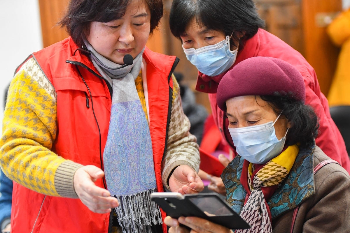 A community volunteer offers training service on smartphone usage to senior citizens in Changsha, Hunan province, in January. [Photo/Xinhua]