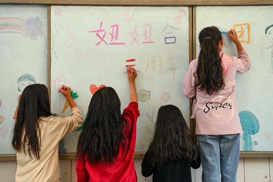 Members of a children's choir paint the name of the choir at Dacao central primary school in Puge County, Liangshan Yi Autonomous Prefecture, southwest China's Sichuan Province, Aug. 4, 2021. (Xinhua/Xu Bingjie)