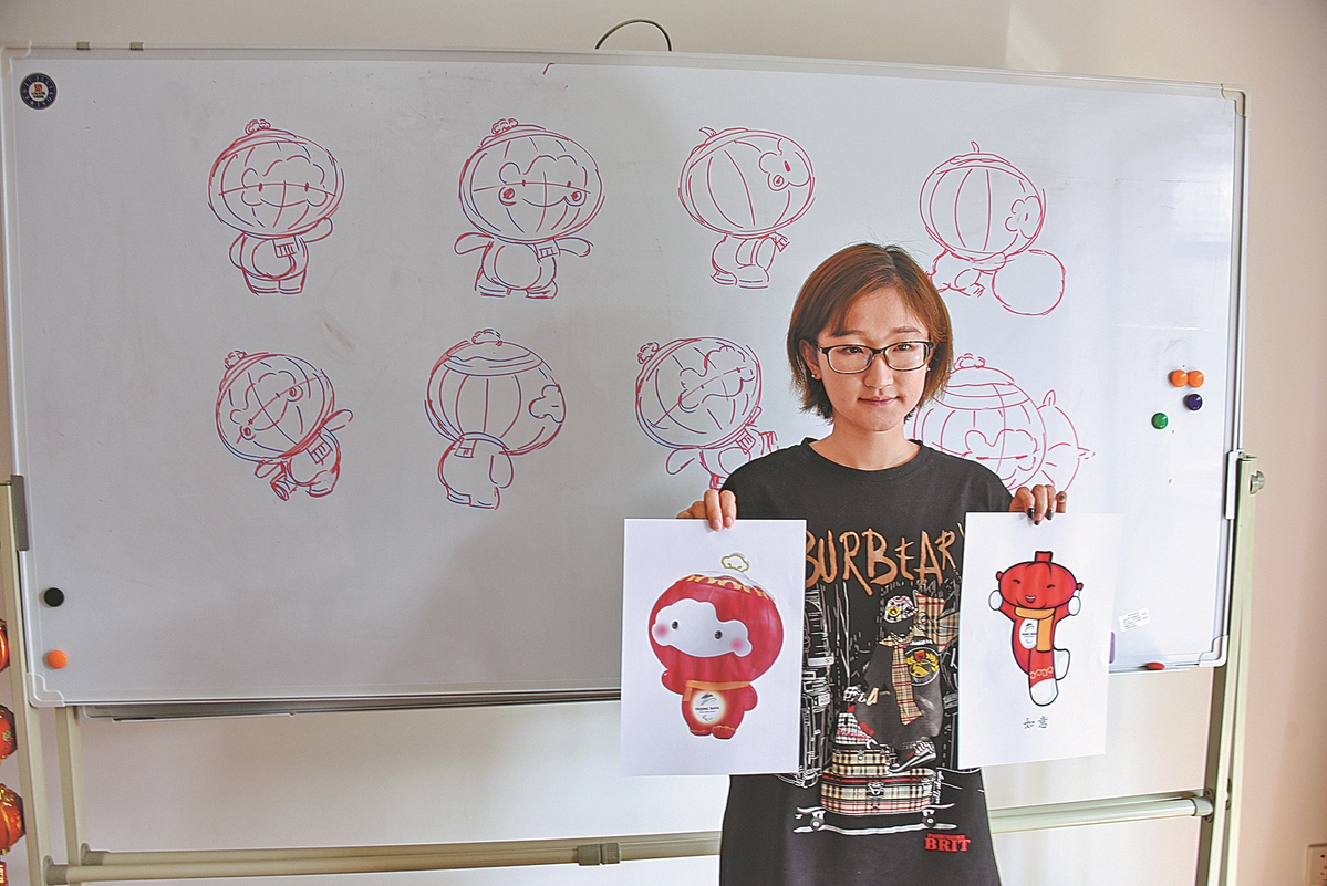 Jiang Yufan displays her design for Paralympic mascot Shuey Rhon Rhon at a news conference held in Beijing. [Photo provided to China Daily]