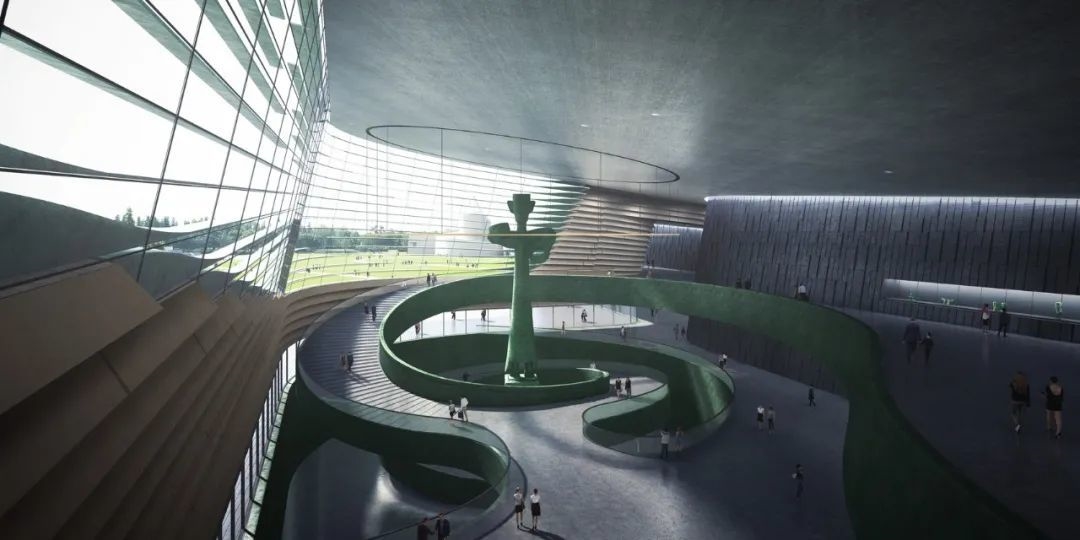 本次设计的“古蜀之眼”——新馆外立面上两个巨大的玻璃窗口,就像三星堆青铜面具中的眼睛一样成为视线交流的核心。设计取意“堆列三星,古蜀之眼”,通过极富表现力的眼睛,仿佛在与观众进行一场穿越时空的对话。 建筑屋顶倾斜延伸,消隐融入场地,与原有一号馆形体左右呼应,建筑形成三个沿中轴排列的覆土堆体——寓意“堆列三星”。