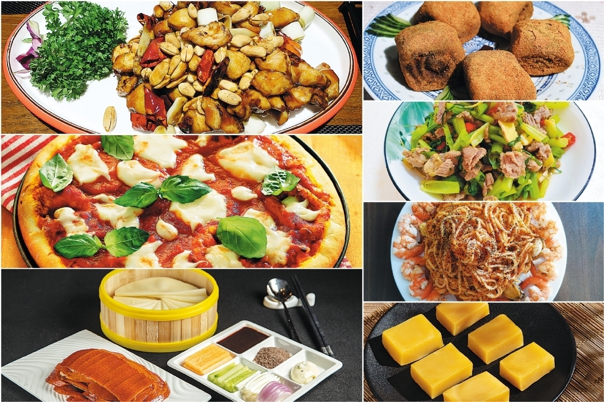 Dishes on the menu for athletes during the Beijing 2022 Olympic and Paralympic Winter Games include (clockwise from top left) kung pao chicken, lyudagun,sauteed shredded beef with celery,spaghetti, pea cake,Beijing roast duck, andmargherita pizza.CHINA DAILY