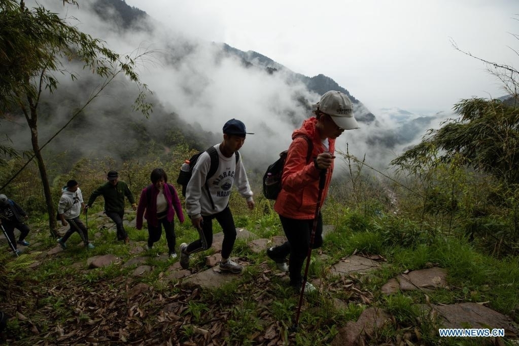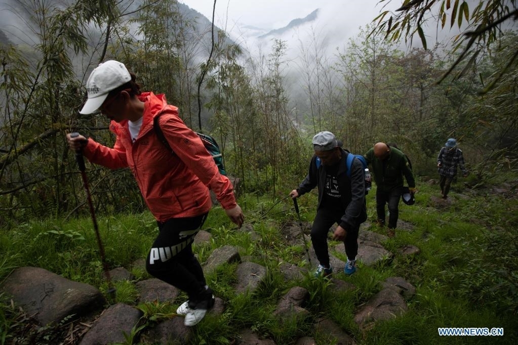 Hikers walk along a section of an ancient Tea Horse Road of Daxiangling in Yingjing County, southwest China's Sichuan Province, April 18, 2021. Yingjing County has been trying to promote its tourist industry by taking advantage of its rich forest resources. (Xinhua/Jiang Hongjing)