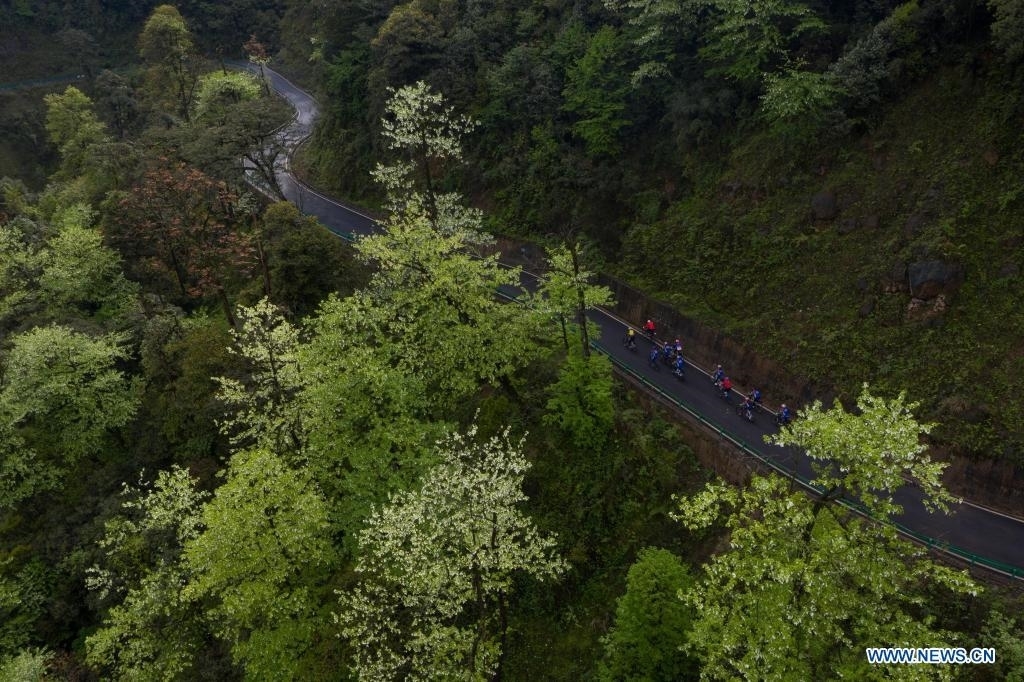 Aerial photo taken on April 18, 2021 shows people riding in Longcanggou National Forest Park in Yingjing County, southwest China's Sichuan Province. Yingjing County has been trying to promote its tourist industry by taking advantage of its rich forest resources. (Xinhua/Jiang Hongjing)