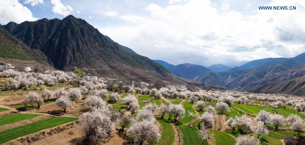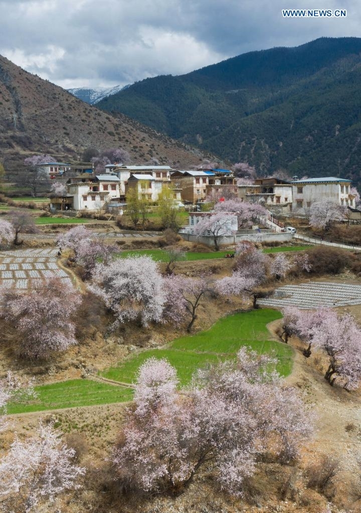Aerial photo taken on April 3, 2021 shows the scenery of Ridang Village of Baisong Town in Derong County, southwest China's Sichuan Province. Peach blossoms are in full bloom in Derong County. In recent years, the local government has taken advantage of the natural resources to develop rural tourism and helped increase villagers' income. (Xinhua/Jiang Hongjing)