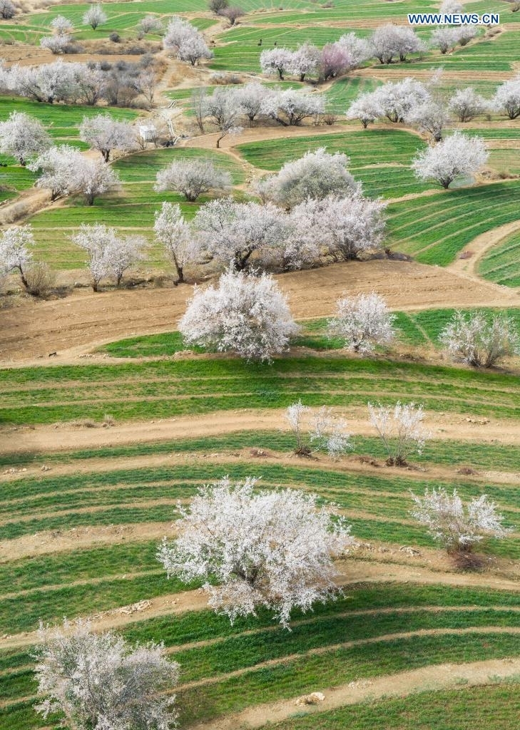 People walk among peach blossoms in Zhage Village of Taiyanggu Town in Derong County, southwest China's Sichuan Province, April 4, 2021. Peach blossoms are in full bloom in Derong County. In recent years, the local government has taken advantage of the natural resources to develop rural tourism and helped increase villagers' income. (Xinhua/Jiang Hongjing)
