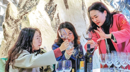 Consumers try imported wine at the Chengdu-Eurasia National (Commodity) Pavilion in Chengdu International Railway Port. WU JING/CHINA DAILY