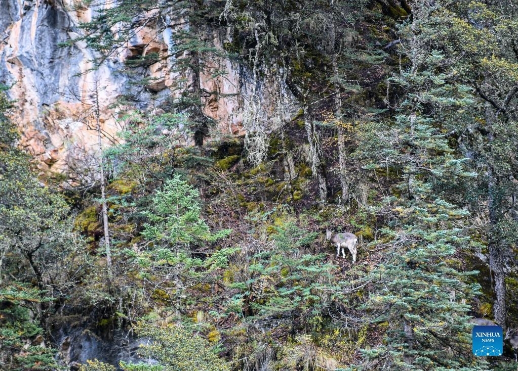 Photo taken on Oct. 23, 2021 shows a blue sheep in Babagou scenic spot in Baiyu County, Ganzi Tibetan Autonomous Prefecture, southwest China's Sichuan Province. (Xinhua/Wang Xi)