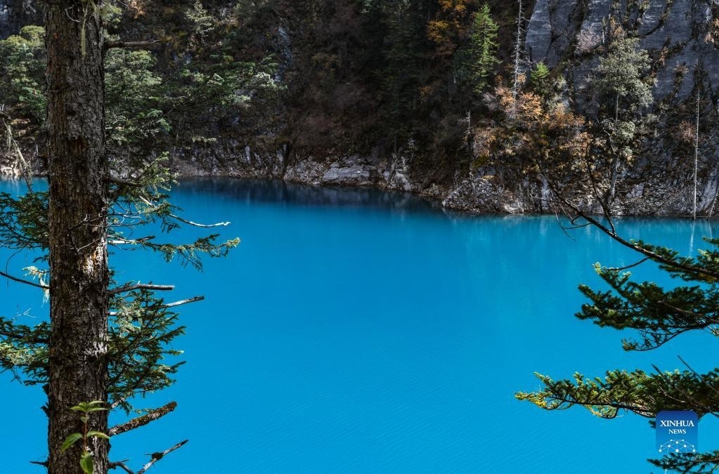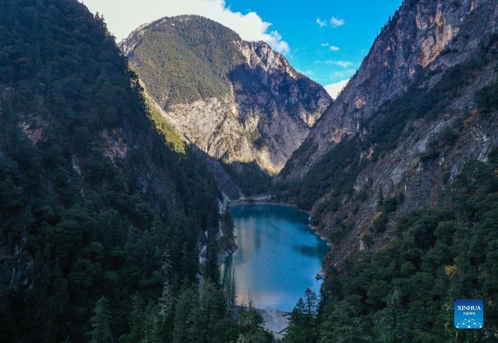 Aerial photo taken on Oct. 23, 2021 shows the scenery of Babagou scenic spot in Baiyu County, Ganzi Tibetan Autonomous Prefecture, southwest China's Sichuan Province. (Xinhua/Wang Xi)