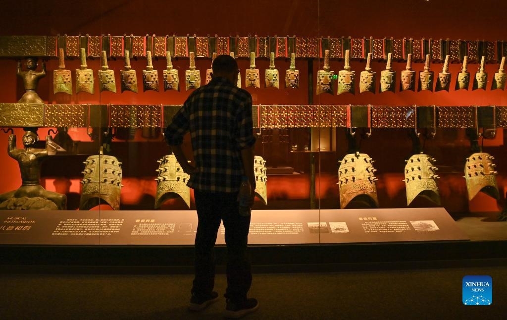 A visitor views exhibits at an exhibition featuring Bronze Age civilizations along the Yangtze River at Sichuan Museum in Chengdu, southwest China's Sichuan Province, Sept. 28, 2021. (Xinhua/Xu Bingjie)
