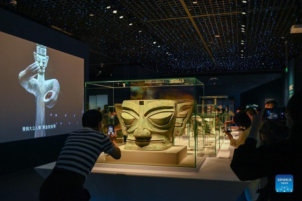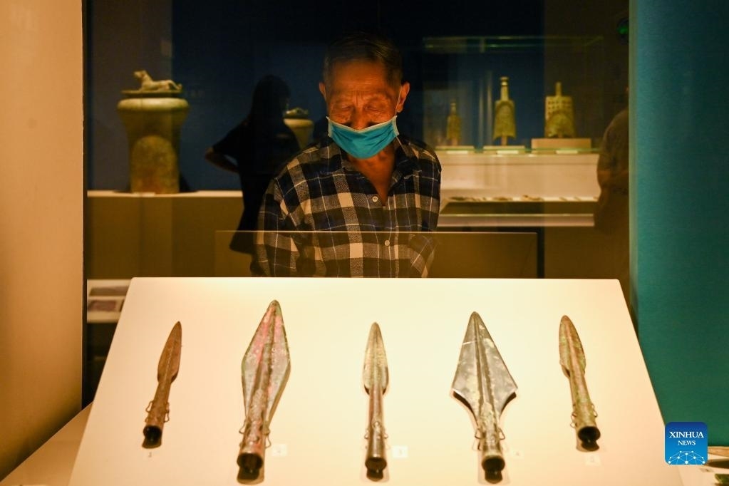 People visit an exhibition featuring Bronze Age civilizations along the Yangtze River at Sichuan Museum in Chengdu, southwest China's Sichuan Province, Sept. 28, 2021. (Xinhua/Xu Bingjie)