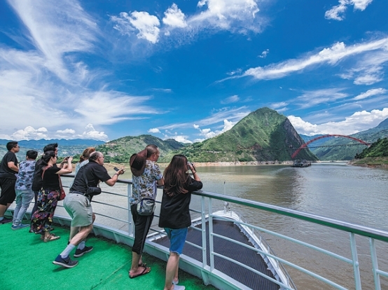 Passengers on the deck of a cruise ship admire scenic views of the Wuxia Gorge off the Yangtze River.[Photo provided to China Daily]