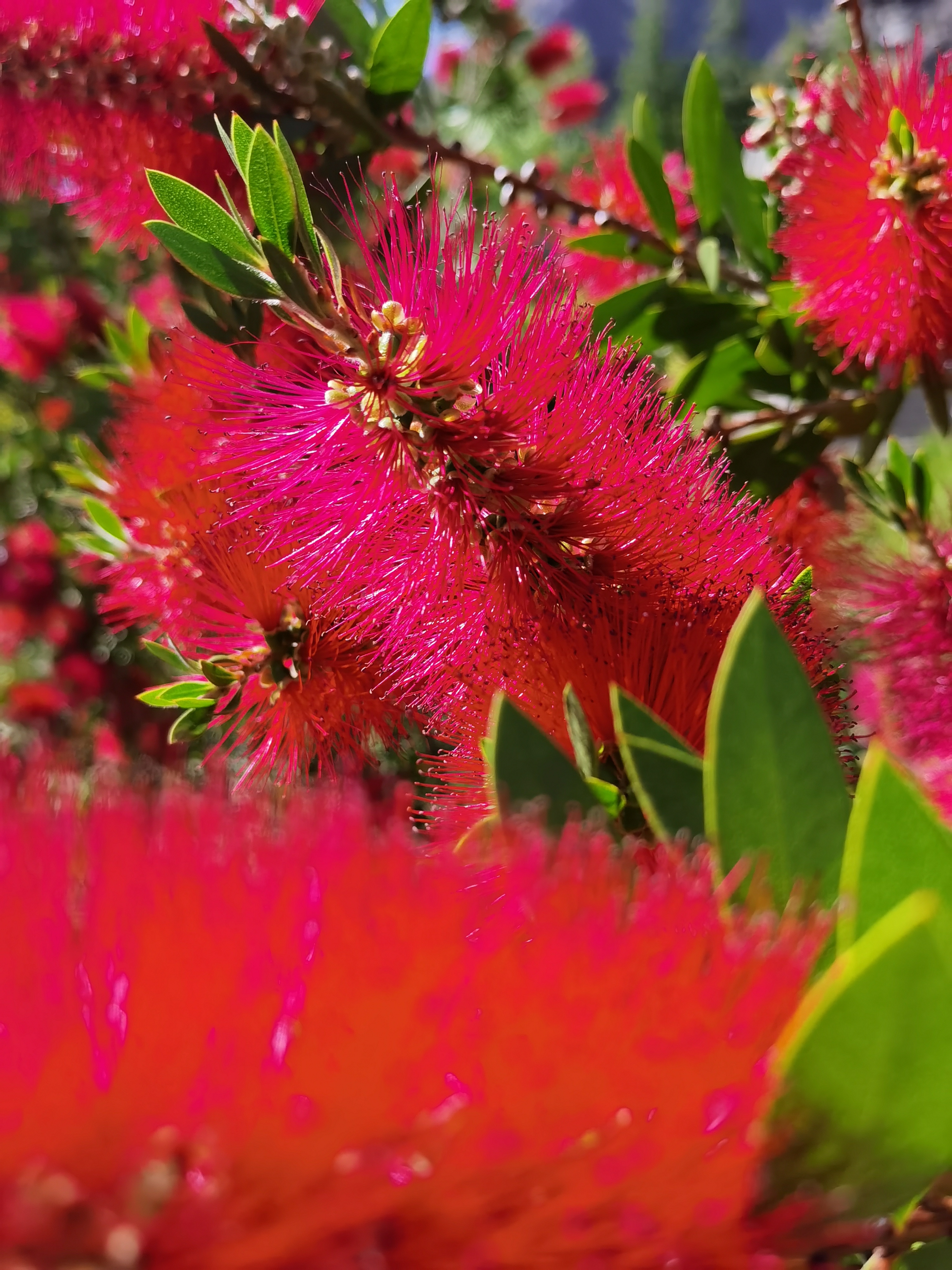 Bottle brush plants grow typically red flowers that look like bottle brushes, hence the name. The flowers' beautiful bright colors make them very attractive to nectar-feeding birds, bees and wasps. The plant is native to Australia, but is cultivated worldwide. Here are some photos of this beautiful plant taken in China's Sichuan Province.
